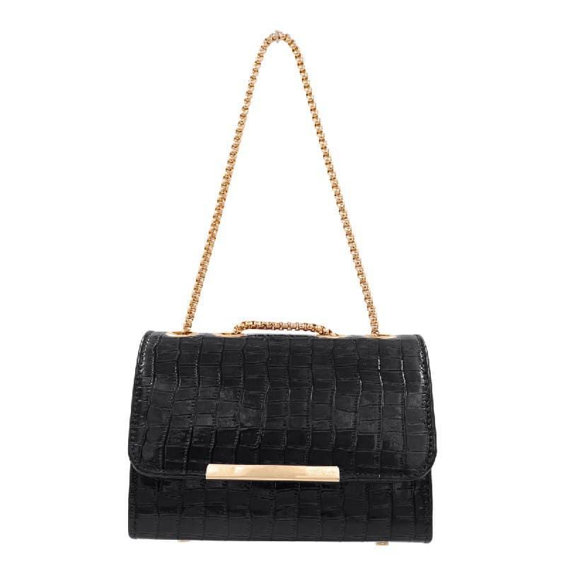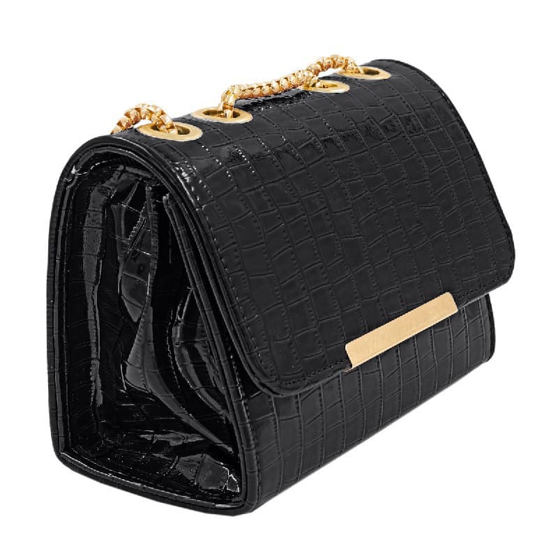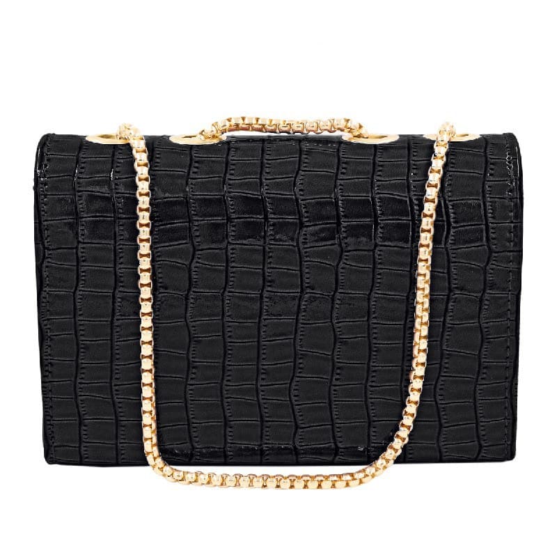 • SPECIFICATIONS : This synthetic leather shiny bag has one compartment and 1 chained pocket. The size of the bag is 22cm x 15cm x 9cm.